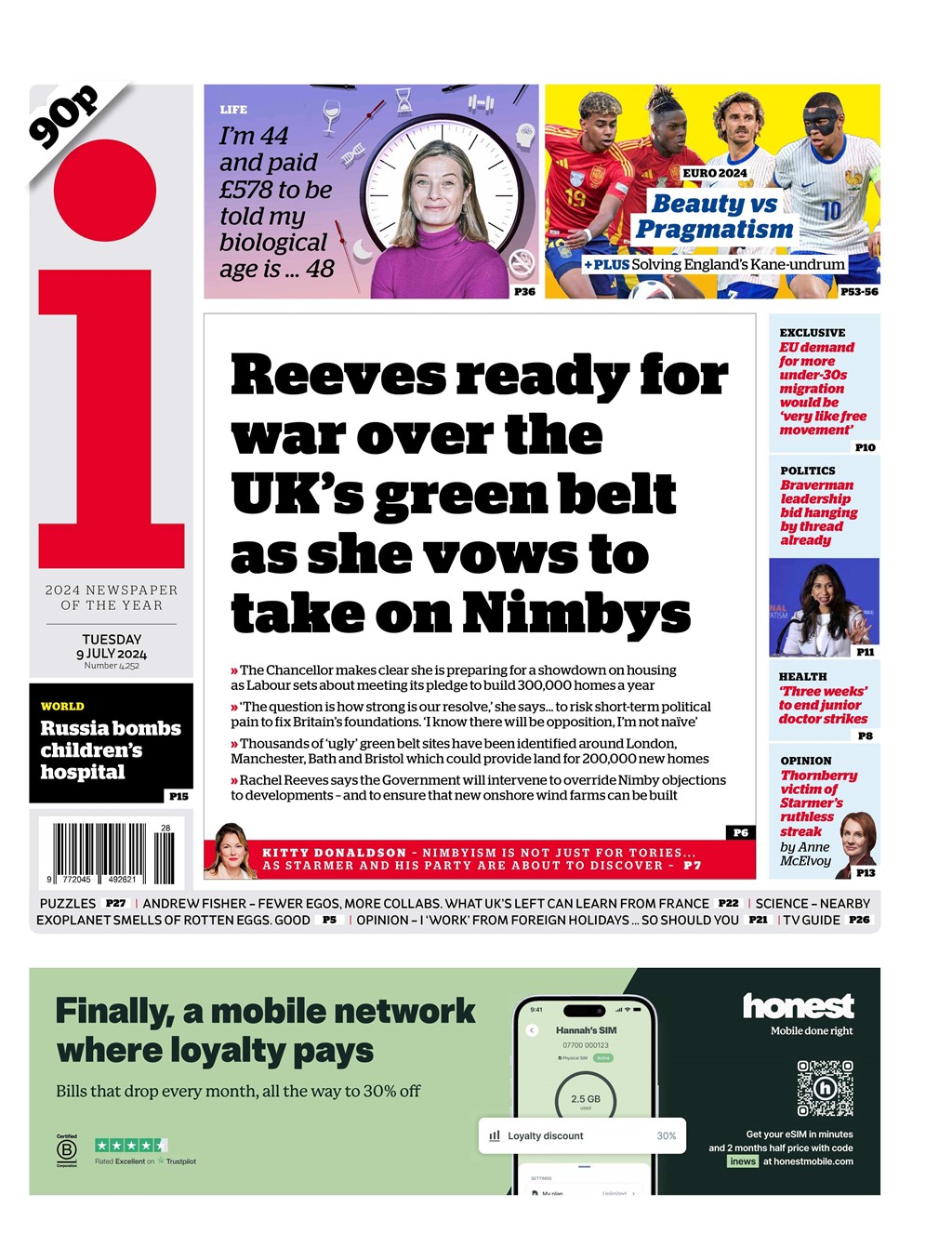 The i reports that the Chancellor is gearing up for a showdown on housing as Labour aims to fulfil its promise of constructing 300,000 homes each year.