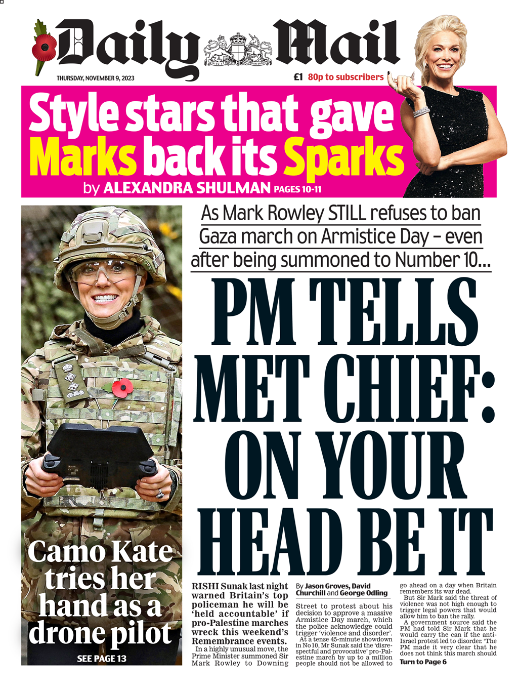 The Daily Mail reports on the Prime Minister’s warning to the Met Police chief about potential disruptions to Remembrance events by pro-Palestine marches.