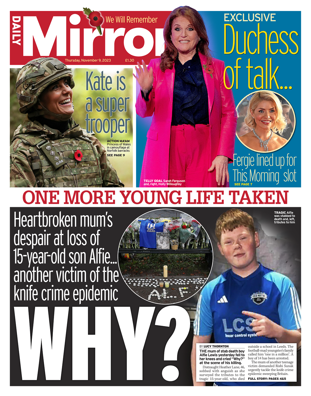 The Daily Mirror reports on the tragic death of Alfie Lewis and the subsequent calls for action on knife crime.