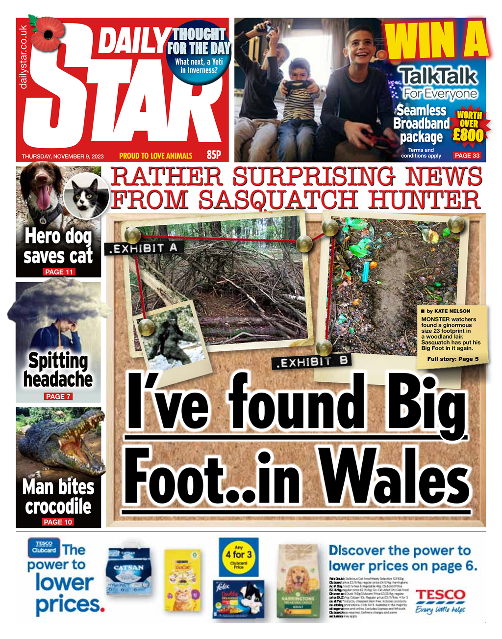 The Daily Star reports a size 23 footprint discovery in Welsh woodland, sparking sasquatch speculation.