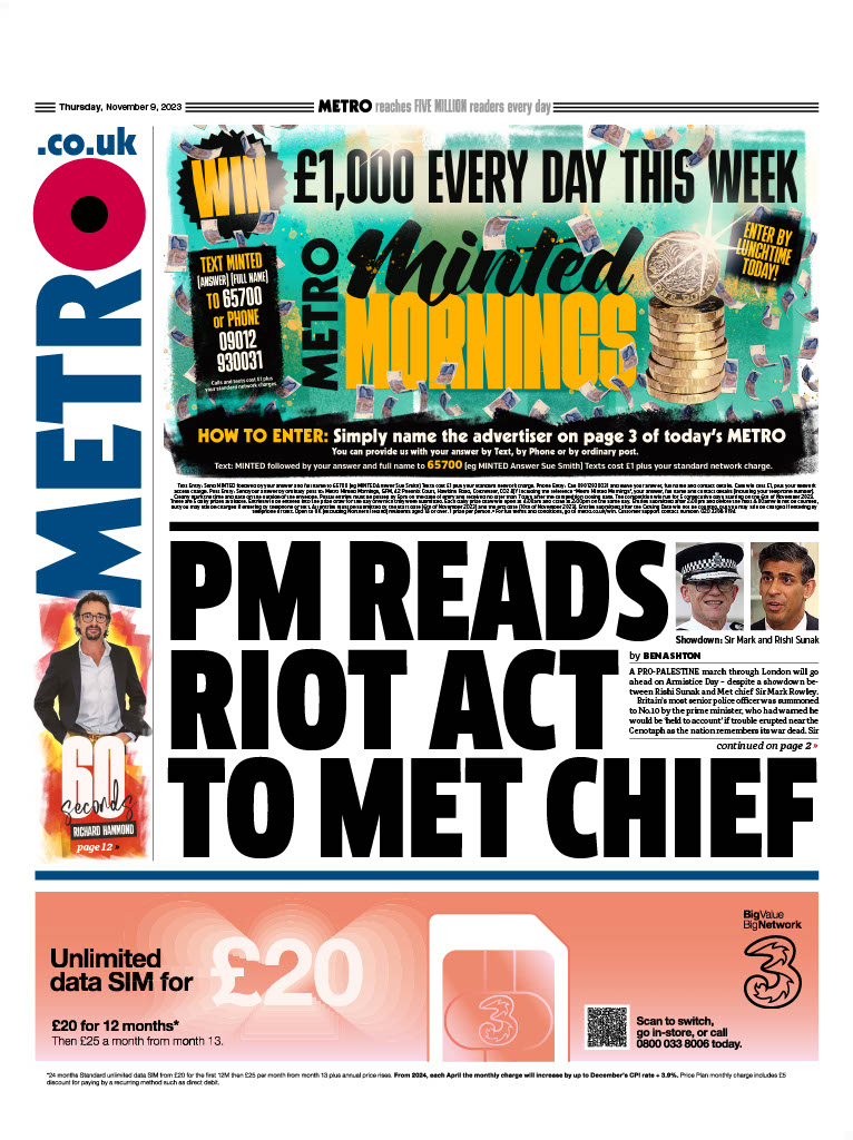 The Metro paper details the upcoming pro-Palestine march in London, which is set to proceed despite a clash between Rishi Sunak and the Met Police chief.