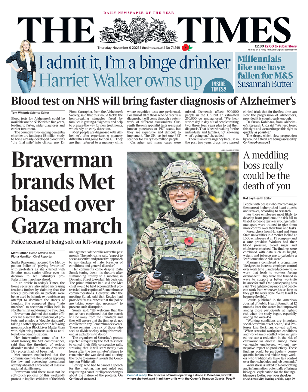 The Times reports on Suella Braverman’s criticism of the Met Police for allegedly showing bias towards protesters.