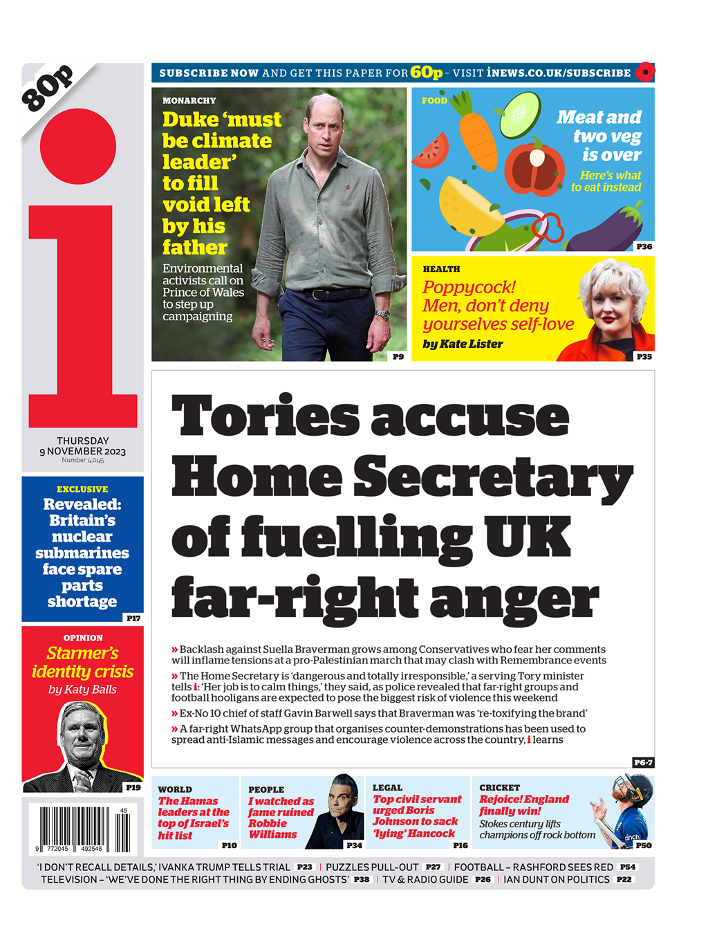 The i reports on the rising internal Conservative party criticism of Home Secretary Suella Braverman’s remarks on the upcoming pro-Palestine march in London.