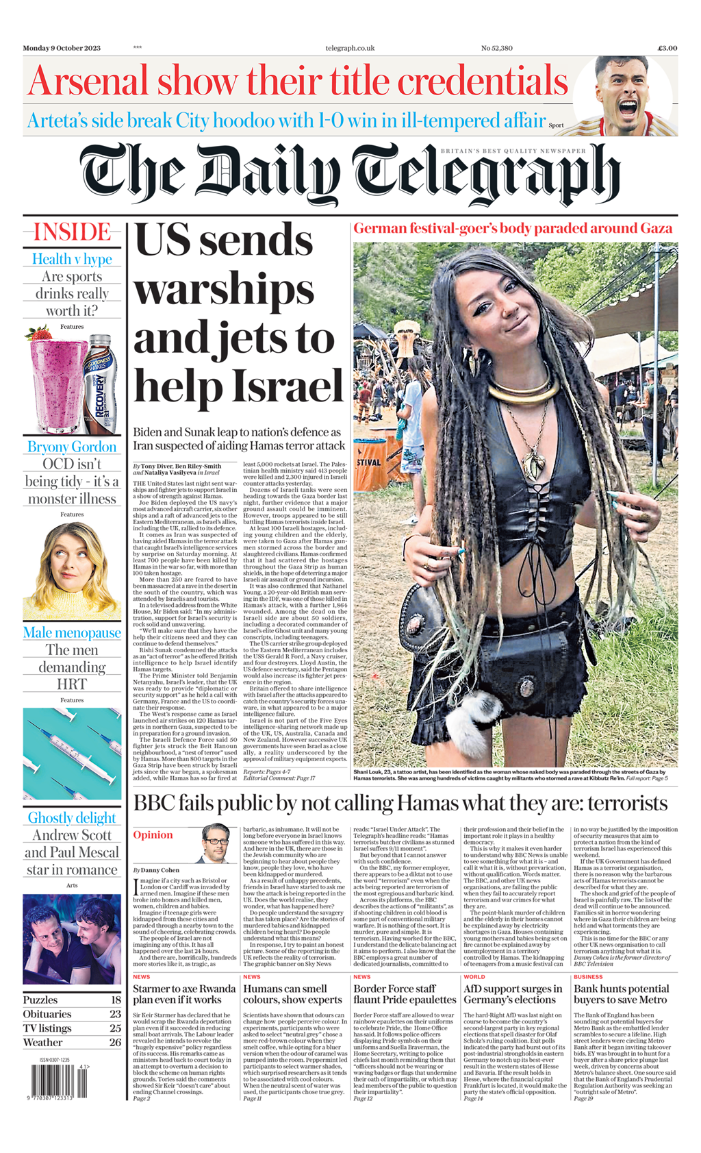 The Daily Telegraph reports on the US deploying a warship and jets to support Israel following Hamas attacks.