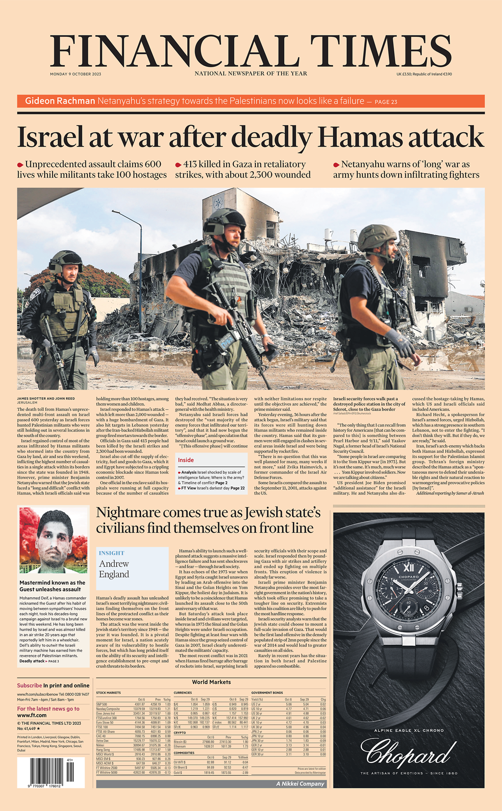 The Financial Times reports on the unprecedented assault by Hamas on Israel, with the death toll surpassing 600.