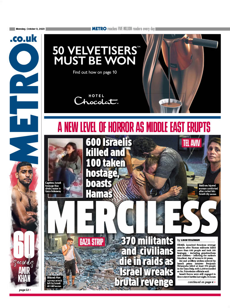 The Metro reports on the eruption of violence in Israel after a weekend attack by Hamas.