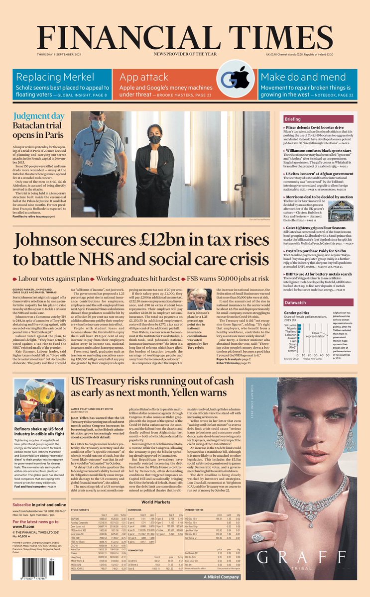 The Financial Times reports on Boris Johnson’s victory in securing £12bn in taxes each year to tackle the NHS and social care crisis.