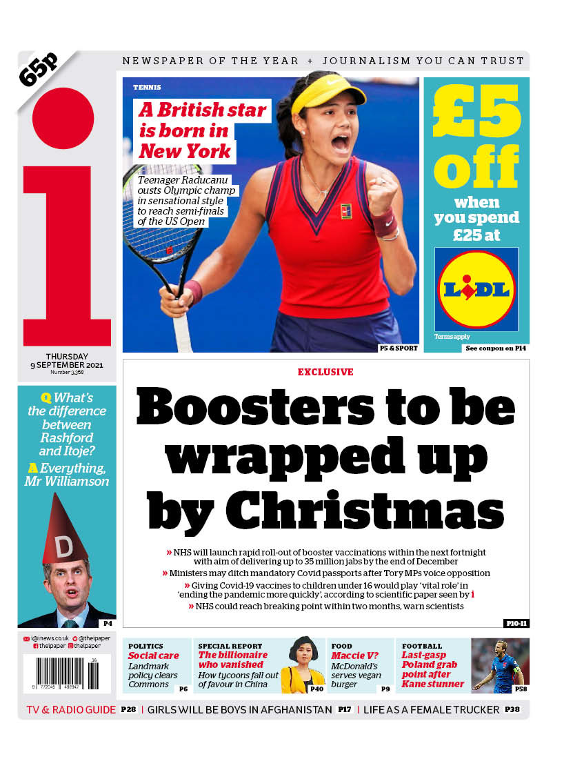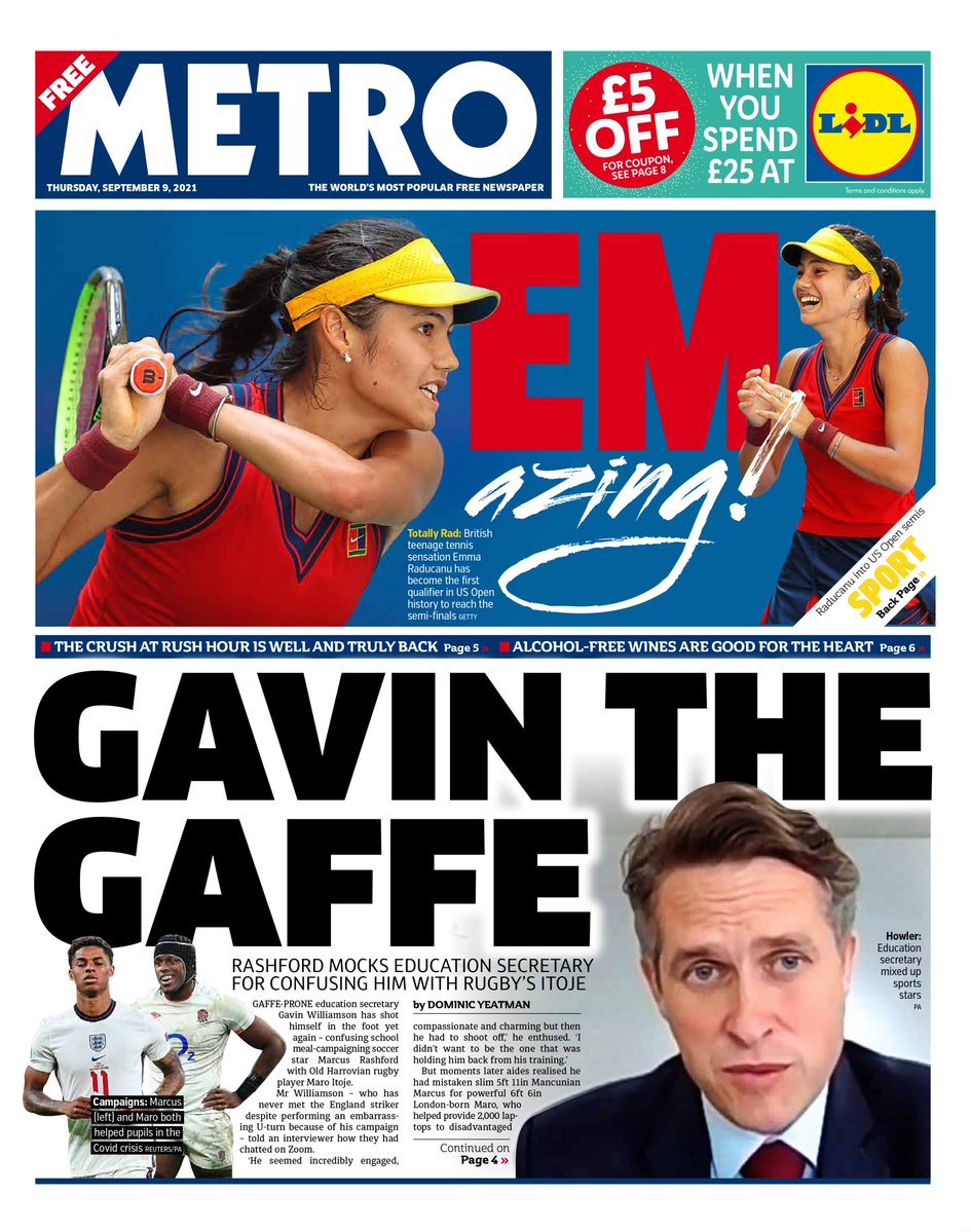 Education Secretary Gavin Williamson confused Marcus Rashford, who campaigned for school meals, with Old Harrovian rugby player Maro Itoje, the Metro reports on its front page.